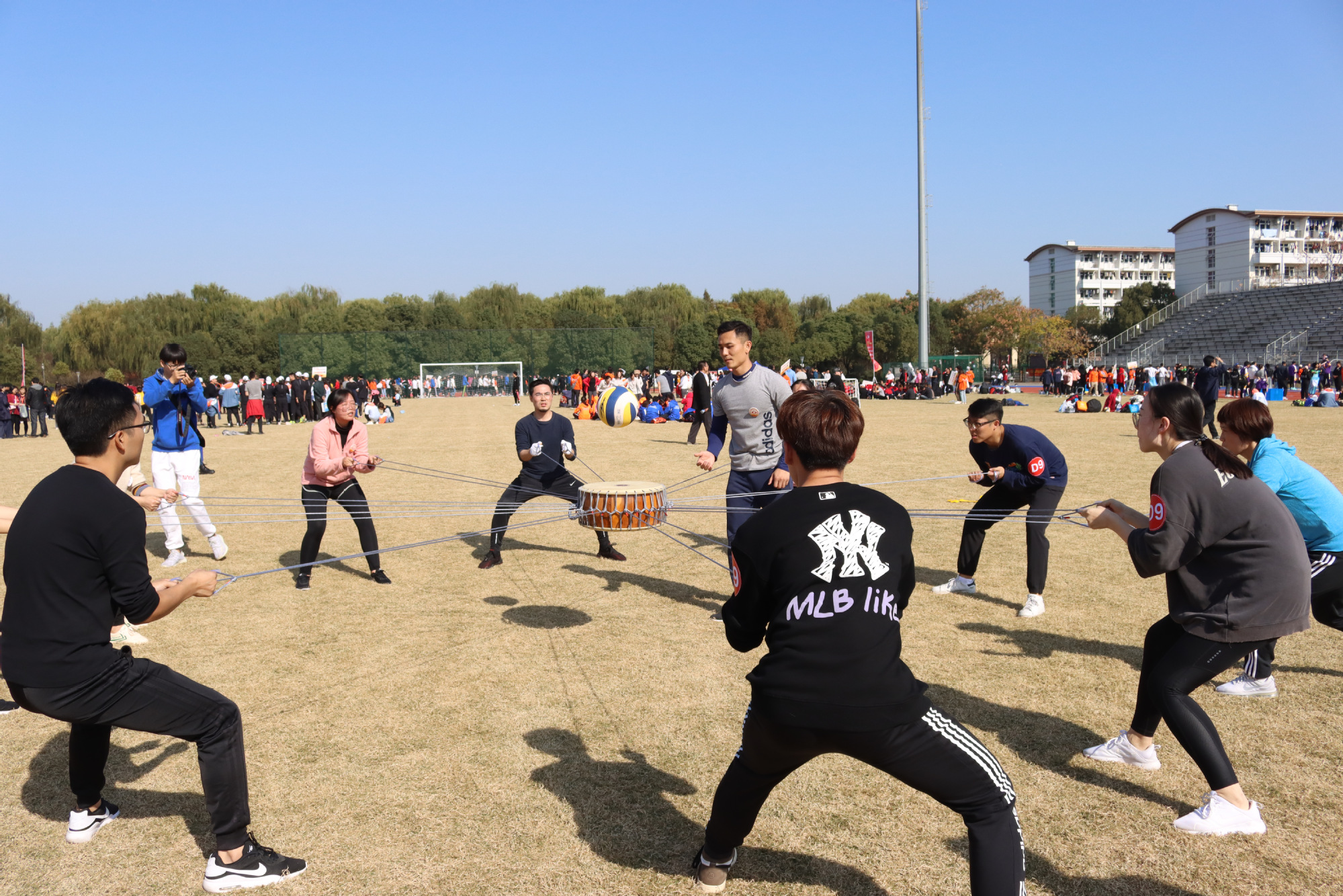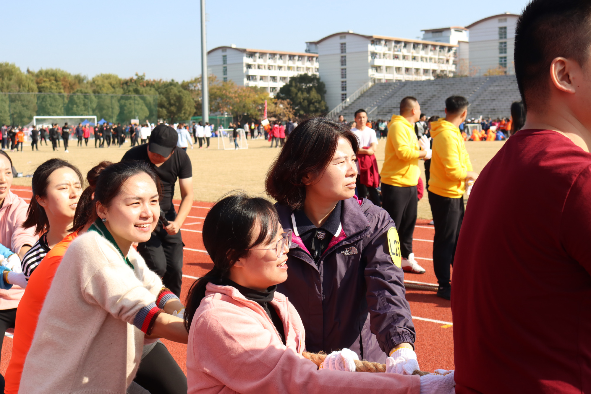 校党委副书记、副校长朱晓青来到赛场看望我校参赛辅导员团队,并与我校辅导员们同携手、齐发力,参与到拔河比赛的激烈较量中。本届团队拓展活动分一鼓作气、袋鼠运瓜、连体足球、绳里乾坤、力拔山河五个项目,一天的赛程是对体魄和智慧的综合考验。经过赛前近一个月的筹备,辅导员们手挽手、脚对脚、肩并肩,团结为魂,协作为要,互相鼓励,和谐又巧妙地完成了各项任务,展现出良好的团队意识和积极向上的精神风貌。