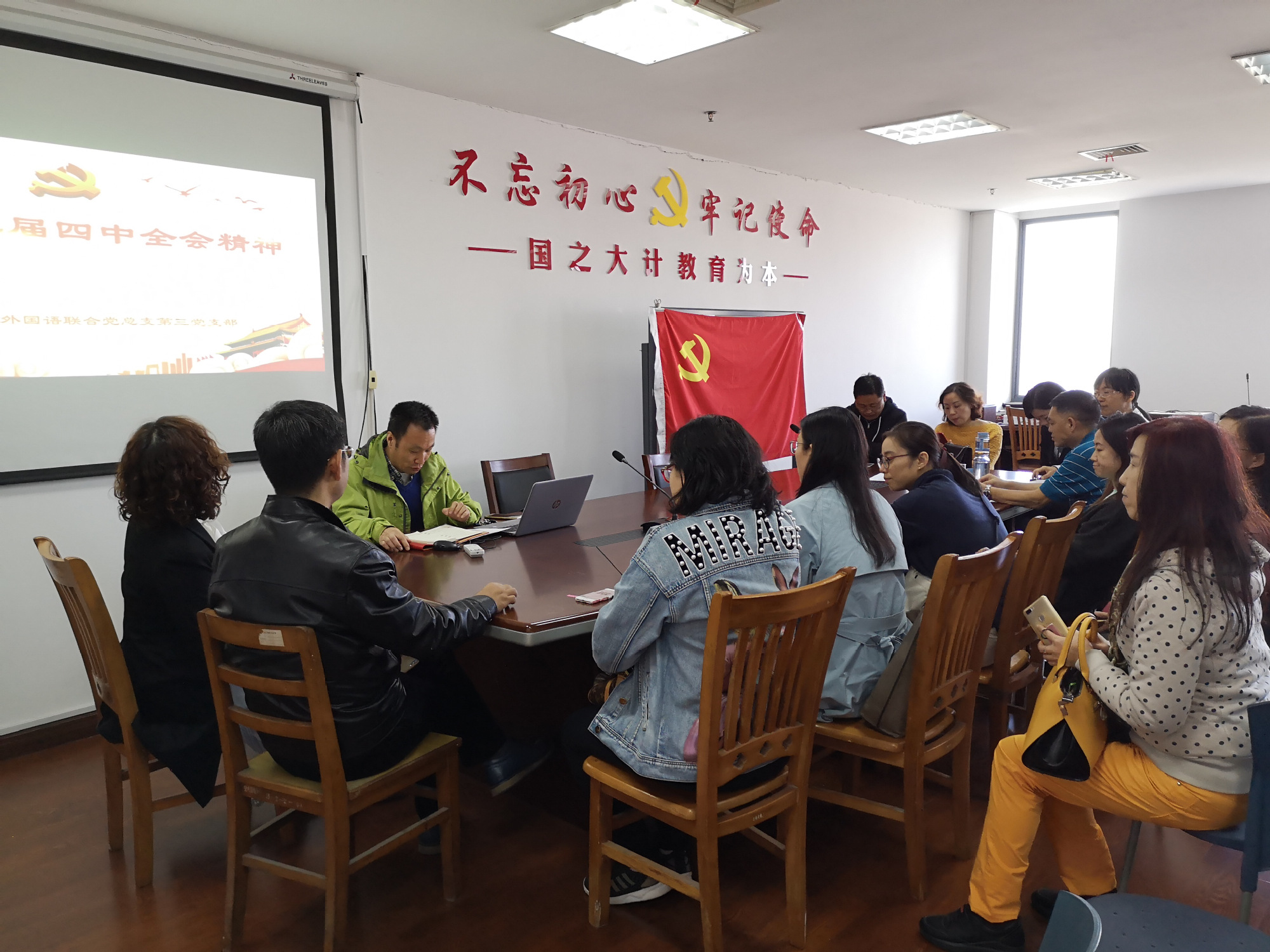 11月15日中午,数理外国语联合党委第三支部召开组织生活会,学习十九届四中全会精神。会议由支部书记胡平主持。