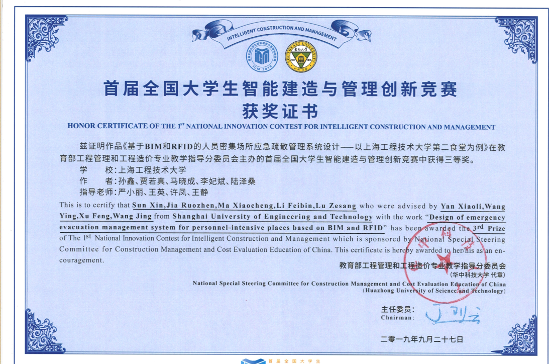 这是今年管理学院工程管理专业团队老师指导学生继已经获得继第五届全国高校BIM大赛毕业设计大赛、第三届全国中高等院校BIM 电子招投标大赛、第五届BIM 网络大赛、第五届全国高校BIM大赛毕业作品大赛等之后又获得的两个全国大学生竞赛的奖项。至此,工程管理团队全体老师带领学生在各项比赛中均获得优异成绩。