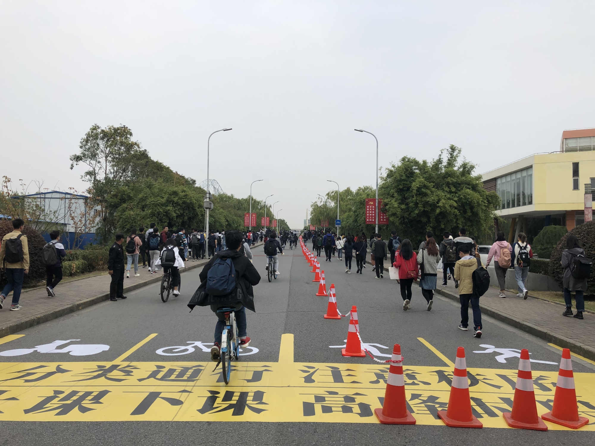走深走实,推动干事往实里走。针对诚信桥人车混行安全问题,通过师生调研与实地走访相结合,建立人车分流新举措,通过张贴地贴醒目标示、音箱播报温馨提示语,结合保卫处支部党员作为交通志愿者等,引导学生人车分流,提高学生交通安全意识。