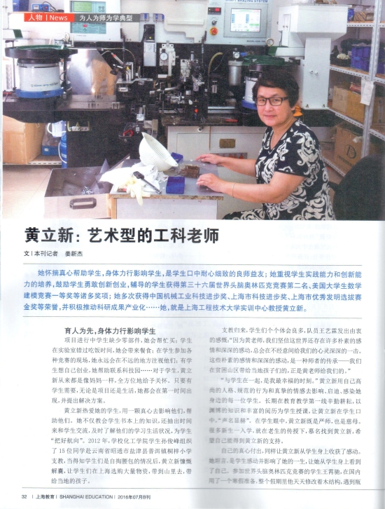 她怀揣真心帮助学生,身体力行影响学生,是学生口中耐心细致的良师益友;她重视学生实践能力和创新能力的培养,鼓励学生勇敢创新创业,辅导的学生获得第三十六届世界头脑奥林匹克竞赛第二名、美国大学生数学建模竞赛一等奖等诸多奖项;她多次获得中国机械工业科技进步奖、上海市科技进步奖、上海市优秀发明选拔赛金奖等荣誉,并积极推动科研成果产业化……她,就是上海工程技术大学实训中心教授黄立新。