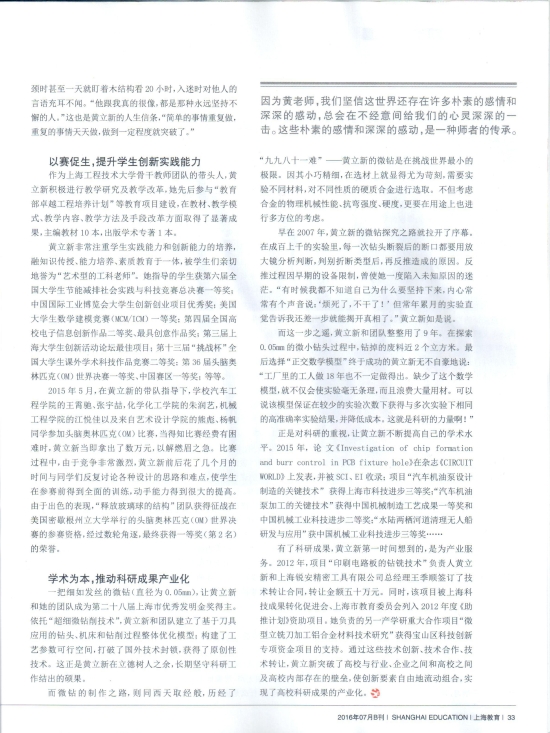 一把细如发丝的微钻(直径为0.05mm),让黄立新和她的团队成为第二十八届上海市优秀发明金奖得主。依托“超细微钻削技术”,黄立新和团队建立了基于刀具应用的钻头、机床和钻削过程整体优化模型;构建了工艺参数可行空间,打破了国外技术封锁,获得了原创性技术。这正是黄立新在立德树人之余,长期坚守科研工作结出的硕果。