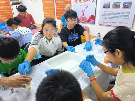 7月11日、18日、21日,化学化工学院高分子材料与工程专业教工党支部联合保利西子湾居委会和党支部开展了三期“探秘神奇化学,点燃科学梦想”活动,分别进行了自制变色指示剂、制作水精灵、彩虹雨等实验。