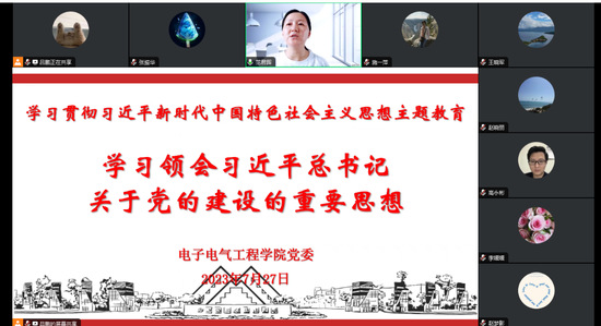 为扎实推进学习贯彻习近平新时代中国特色社会主义思想主题教育,7月27日,电子电气工程学院党委通过线上形式开展专题学习会,学习领会习近平总书记关于党的建设的重要思想,学院党委委员、党政班子参加学习,学习会由学院党委书记范君晖主持。