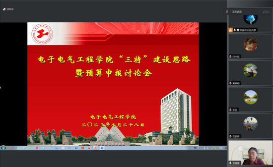 7月28日上午,电子电气工程学院在线召开“三特”(特点、特长、特色)建设工作研讨会。学院全体党政领导,系、室(中心)主任,教授代表参会,会议由学院党委副书记、院长李媛媛主持。