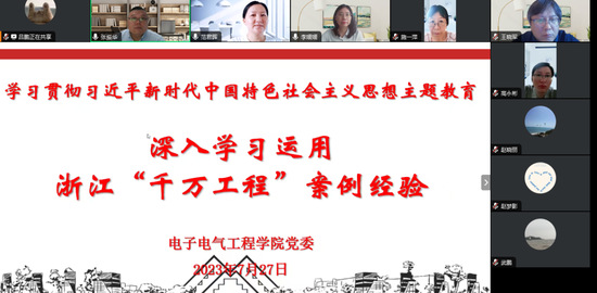 为扎实推进学习贯彻习近平新时代中国特色社会主义思想主题教育,7月27日,电子电气工程学院党委通过线上形式开展专题学习会,深入学习浙江“千万工程”案例经验和“牢记嘱托、再建新功”系列专题党课中关于建设人民城市相关内容,学院党委委员、党政班子参加学习,学习会由学院党委书记范君晖主持。