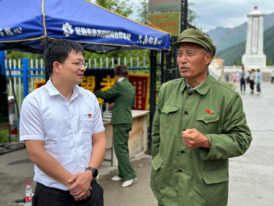 团队成员前往乔尔玛烈士陵园参观瞻仰,图为戴振华老师与2013年感动中国年度人物陈俊贵同志交谈时的场景