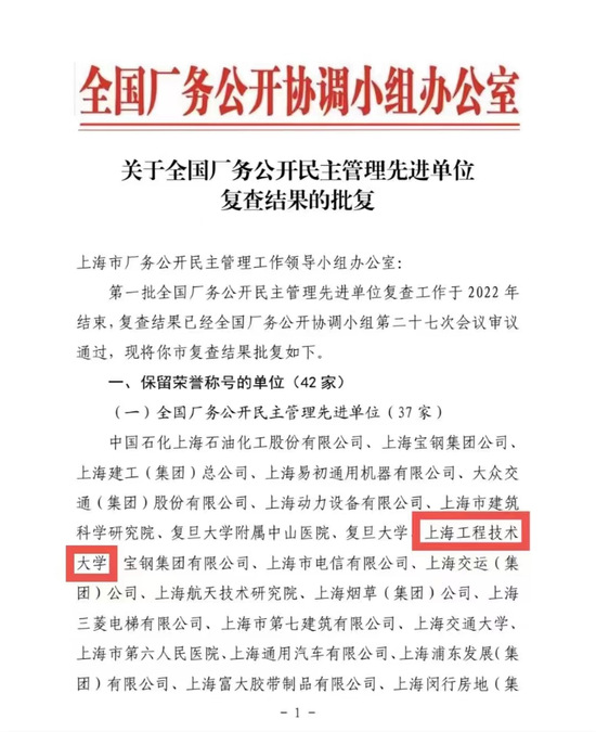 据悉,上海市共有37家单位在本次复查中保留全国厂务公开民主管理先进单位荣誉称号,其中教育系统仅4所高校继续获得此项荣誉,我校名列其中。我校于2003年荣获“全国厂务公开民主管理先进单位”荣誉称号,是上海市第一批获此殊荣的单位。本次复查对我校“全国厂务公开民主管理先进单位”荣誉称号的保留,是对我校校务公开、民主管理工作成效的再次肯定与充分认可。