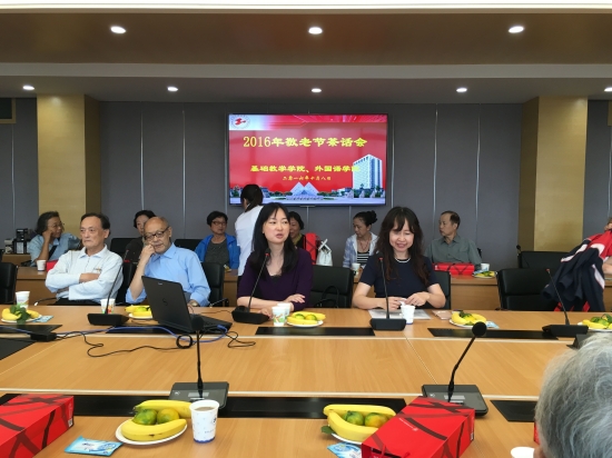 党总支书记王勤主持茶话会,向老同志们致以节日的问候和衷心的祝福。她向老前辈们汇报了基础教学学院和外国语学院十三五期间在学科建设、人才队伍建设、人才培养、科学研究等方面的发展基础与发展目标以及外国语学院专业建设、招生工作和学生工作,并代表学院的在职教职工感谢退休教师们为学院发展所作的贡献,特别是教学质量把控上,感谢他们对学院的发展一如既往的关心。难忘老同志的优良传统和崇高精神,难忘尊重、学习、关心和爱护老同志的责任和使命,期待老教师们一如既往地关心、支持学院的建设和发展。工会主席张蓓,对老教师们表示节日的慰问,感谢老前辈们对学院发展的历史功绩和巨大贡献以及对工会工作的支持和建议。祝福老同志们身体健康、生活美满。