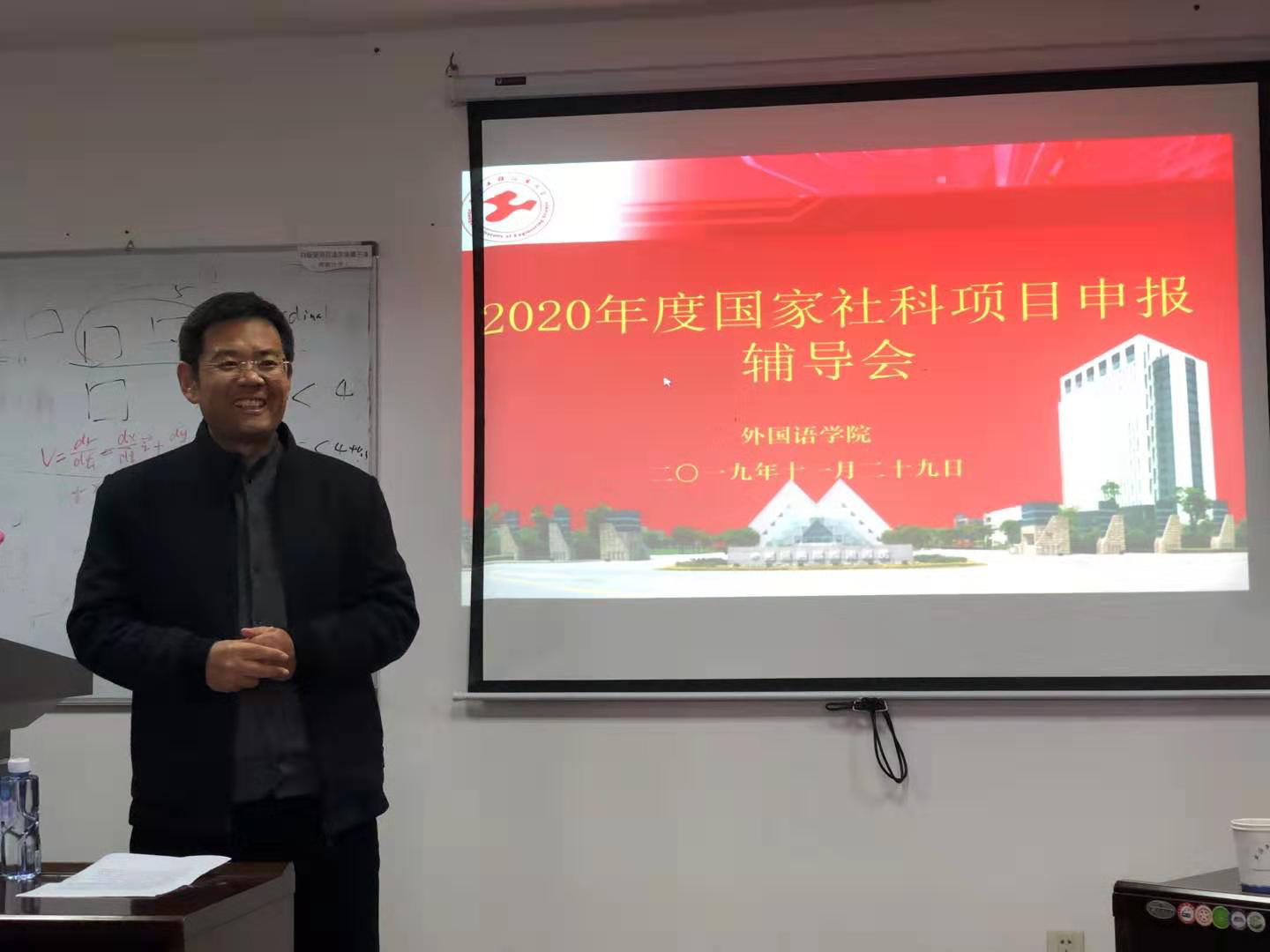 在全校上下进行“不忘初心、牢记使命”主题教育的背景下,为了进一步把主题教育精神和学校的三大发展战略落到实处,助力学院高水平科研项目申报,11月29日上午,上海师范大学博士生导师朱振武教授、上海交通大学外国语学院常务副院长常辉教授应邀来到我校外国语学院,为准备申请2020年度国家哲社项目的教师进行面对面的指导。辅导会由外国语学院副院长张冰天副教授主持。