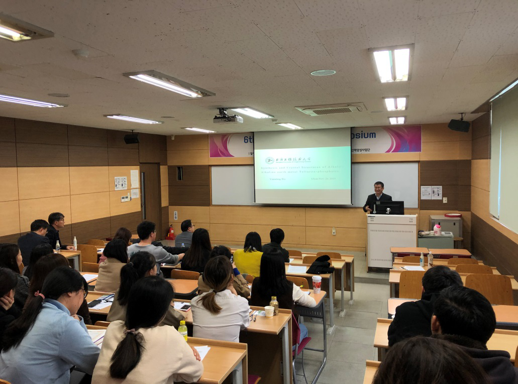 Hur Seung-Hyun院长介绍了两校在人才培养、学术科研等方面取得的新成果。我校陆杰教授、吴远东教授、杨靖霞副教授分别做了题为“Pharmaceutical Crystallization: Polymorphism & Cocrystals”、“Synthesis and Crystal Structures of Alkali-Alkaline Earth Metal Tellurite-Phosphates”、“Microstructure Manipulation of Bimetallic Oxides by Sol-Gel Method and CeO2 by Microwave-Aided Synthesis”的专题报告;蔚山大学化学与生物化学工程学院的师生代表先后介绍了各自的研究领域及取得的最新研究成果;双方就目前研究方向的共同性及今后将要开展学术交流与合作的领域进行了深入探讨。最后,中韩两校学生设计的学术墙报进行了展示与评比,我校学生周婧雯、宋巧玲、柴飞的作品获得优秀墙报奖。
