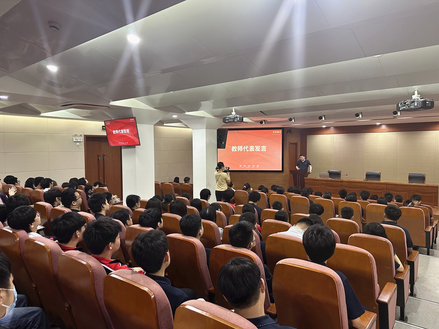 教师代表吴奇老师和张艳老师带来了全体教学团队的期望,希望同学们潜心学习各科知识,练就熟练的外语应用技能,用勤奋与拼搏赢得希望与收获,用纪律与约束赢得理智与自由,用拼搏与超越赢得成功与辉煌。2022级房邦国同学和汪咨羽同学代表老学员发言,鼓励同学们在校学习期间拓宽国际视野,坚定信心、确定目标,以饱满的热情开启人生新篇章。2023级王培薪同学和李语歆同学代表新学员发言,表达了珍惜学习机会、遵守校纪校规、提升自我,锻炼自己成为身心健康、有使命担当的终身学习者和优雅生活者的决心和愿望。
