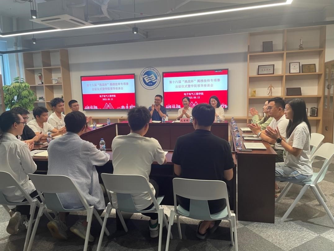 为进一步落实立德树人的根本任务,给予第十八届“挑战杯”专项赛参赛队伍切实的关怀与帮助,为参赛选手鼓士气。9月13日下午,电子电气工程学院在现代交通工程中心教工小家召开第十八届“挑战杯”揭榜挂帅专项赛出征仪式暨赛前座谈会,电子电气工程学院党委书记范君晖、党委副书记赵梦影、吴飞教授等出席会议。
