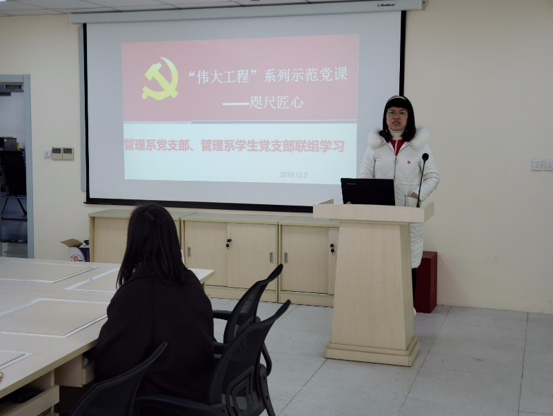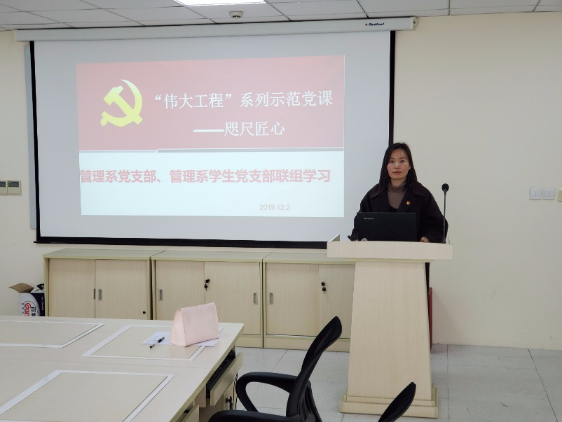12月2日中午,高职学院管理系教工党支部联合管理系学生党支部在图文信息中心502召开“不忘初心、牢记使命”主题教育联组学习暨“伟大工程”系列示范党课——咫尺匠心首轮试讲。管理系全体党员、管理系学生党支部全体党员和学生入党积极分子共同参加。会议由管理系党支部书记刘春娣主持。