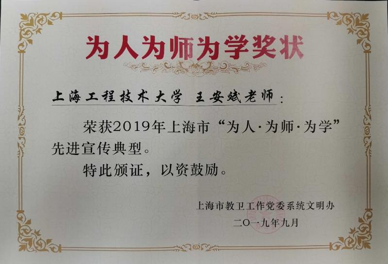 为深入贯彻落实习近平新时代中国特色社会主义思想和党的十九大精神,贯彻落实习近平总书记关于教育的重要指示,坚持不懈用习近平新时代中国特色社会主义思想铸魂育人,引导广大教师积极践行社会主义核心价值观,争做“四有”好老师,树立一批教书育人的先进典型,激励广大教师履行立德树人的崇高使命,讲好行进中的上海教育人的精彩故事,营造“教育报国守初心、立德树人担使命”的浓郁氛围。上海市教卫工作党委、市教委开展了2019年“为人、为师、为学”先进典型宣传活动,我校踊跃参与、积极申报,经过层层选拔,我校王安斌教授荣获2019年上海市“为人·为师·为学”先进宣传典型。