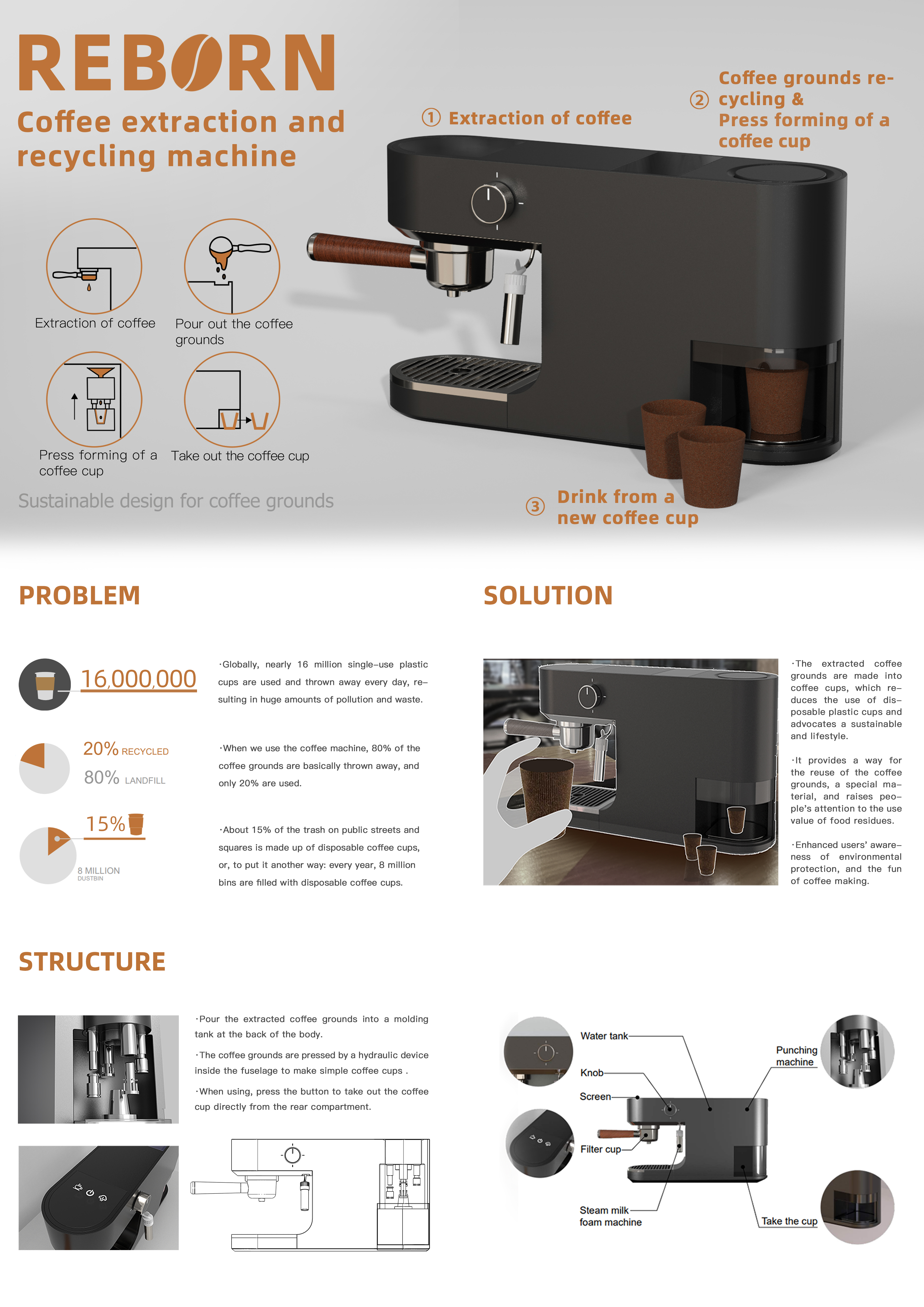 设计简介:在全球,每天因饮用咖啡有大量的一次性塑料杯被使用并丢弃,造成巨大的资源浪费,同时对于咖啡渣这种材料几乎难有利用的空间。本设计通过设计一台可以制作杯子的咖啡机,将萃取过后的咖啡渣高压制成咖啡杯,减少了一次性塑料杯的使用;我们可以重复使用咖啡渣,为咖啡渣这一具有可塑性的特殊材料提供二次利用的途径,同时提高人们对食品残余物利用价值的关注,倡导可持续低碳的生活方式。设计不仅提升了用户的生活环保意识,同时也增强了咖啡制作过程中的趣味性。