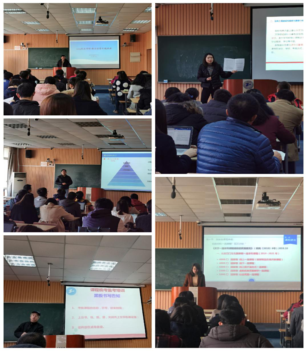 教学常规工作主题讲座包括教学质量、教学研究、教学实践、现代教学技术、教学运行五个模块。1.教学质量方面。教学质量管理办公室唐春锋老师对《教学事故认定及处理办法》进行了详细解读,期望教师能够维护正常的教学秩序,切实保证教学质量。2.教学研究方面。教务处研究科崔琳琳老师以OBE教育模式为切入点,对培养方案、教学大纲、教案、教学方案等进行了详细地解读,同时还向大家介绍了教学研究项目的申请流程。3.实践创新带教方面。教务处实践科杨光老师从实践教学与教学团队两个方面解读了“三层面、四模式、五模块”的实践教学体系、创新创业训练以及导师带教工作相关要求。4.现代教学技术方面。教务处技术科张航老师向新进老师们介绍了五大建设项目,以及如何运用现代教学技术的方法实现线上线下混合式教学等。5.课程统考监考方面。教务处教务科顾嘉老师系统详细的介绍了在教学运行过程中教师应尽的职责和相关纪律要求。