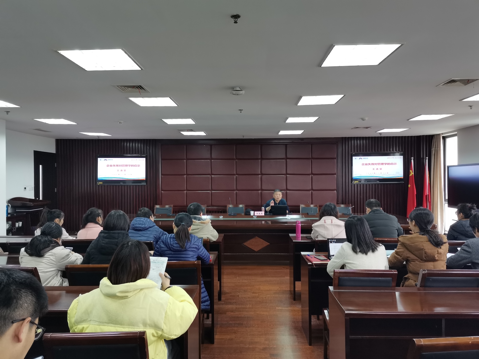 12月20日,管理学院客座教授王逸棠应管理学院邀请在我校行政楼506开展《企业失败——对管理学的启示》学术报告。管理学院老师及部分研究生参加了讲座。报告会由管理学院院长胡斌教授主持。