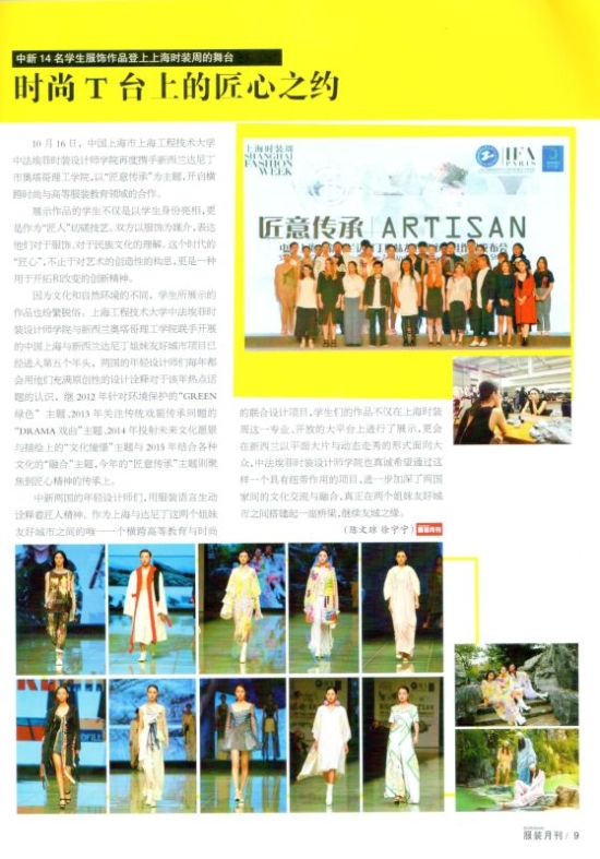 上海工程技术大学中法埃菲时装设计师学院与新西兰奥塔哥理工学院联手开展的中国上海与新西兰达尼丁姐妹友好城市项目已经进入第五个年头,两国的年轻设计师们每年都会用他们充满原创性的设计诠释对于该年热点话题的认识,继2012年针对环境保护的“GREEN绿色”主题、2013年关注传统戏剧传承问题的“DRAMA戏曲”主题、2014年投射未来文化愿景与描绘上的“文化憧憬”主题与2015年结合各种文化的“融合”主题,今年的“匠意传承”主题则聚焦到匠心精神的传承上。