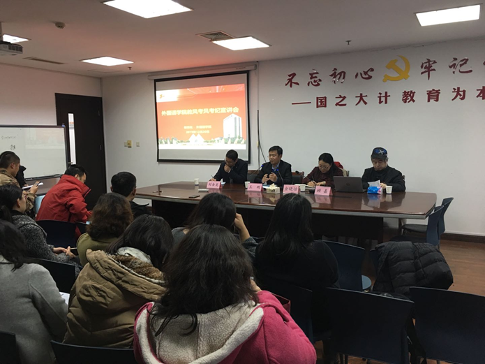 为进一步贯彻落实学校关于加强教风考风考纪宣传教育工作的要求,严肃期末考试纪律,杜绝考试违纪、作弊现象,营造良好的教风、学风和考风,12月20日下午,教务处副处长金晓怡、教务科科长顾嘉老师应邀在行政楼1508会议室为外语学院教师作“外国语学院教风考风考纪”专题宣讲会。外国语学院院长王刚、副院长刘金龙及全体教师参加了本次会议。会议由刘金龙副院长主持。