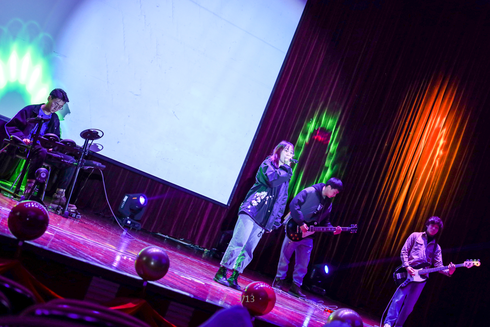 晚会分为三个篇章,第一篇章为保持奋进姿态。学院白日梦想家乐队带来歌曲《Ihatemyselfforlovingyou》点燃了现场的氛围