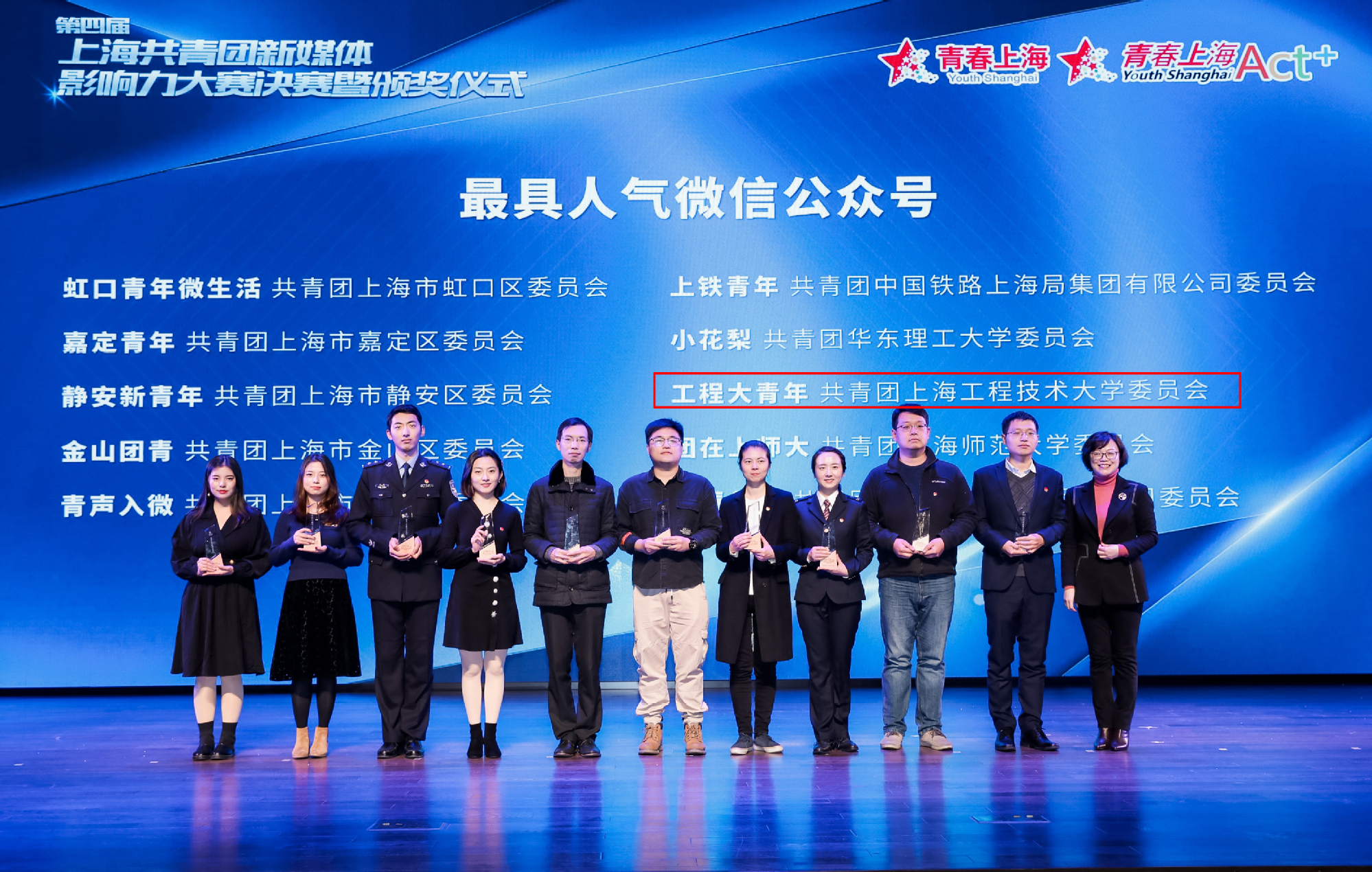 此次评选,共有全市133个来自区县、企事业单位、行业、高校团组织的主要新媒体账号参加角逐。经团市委、媒体、业界专家的评审以及大众投票评比,我校共青团新媒体公众号“工程大青年”获评“上海十大人气共青团微信公众号”。