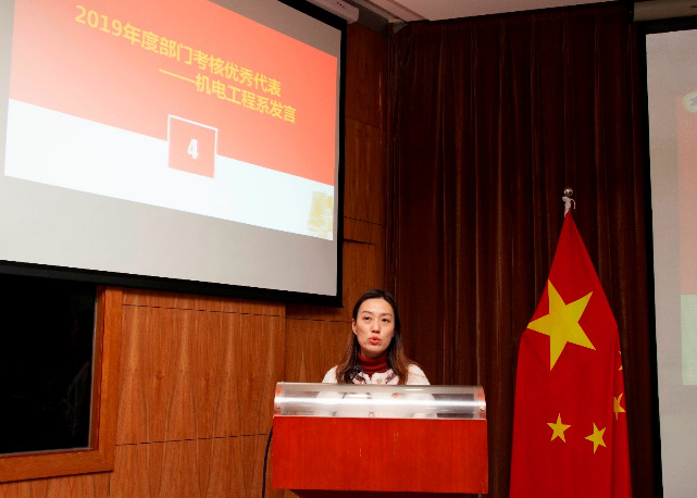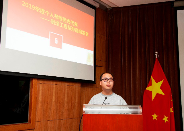 副院校长朱建军宣读表彰决定,学院、校领导为2019年度考核优秀个人及部门颁奖,向获奖者表示衷心的祝贺,同时对同舟共济,同心同德,锐意进取的全体教职工表示衷心的感谢。机电工程系杨洋老师作为优秀部门代表作交流发言。“守正笃实 砥砺奋进 开拓进取 勇担使命”是他们对过去的总结,“竭尽所能 不辱使命”是他们对未来的寄语。制造工程系孙晶海老师作为优秀教师代表发言。热爱本职、钻研业务,培养学生成才是他的初心和使命,科学的理念、长远的眼光、务实的作风是他的工作方式。