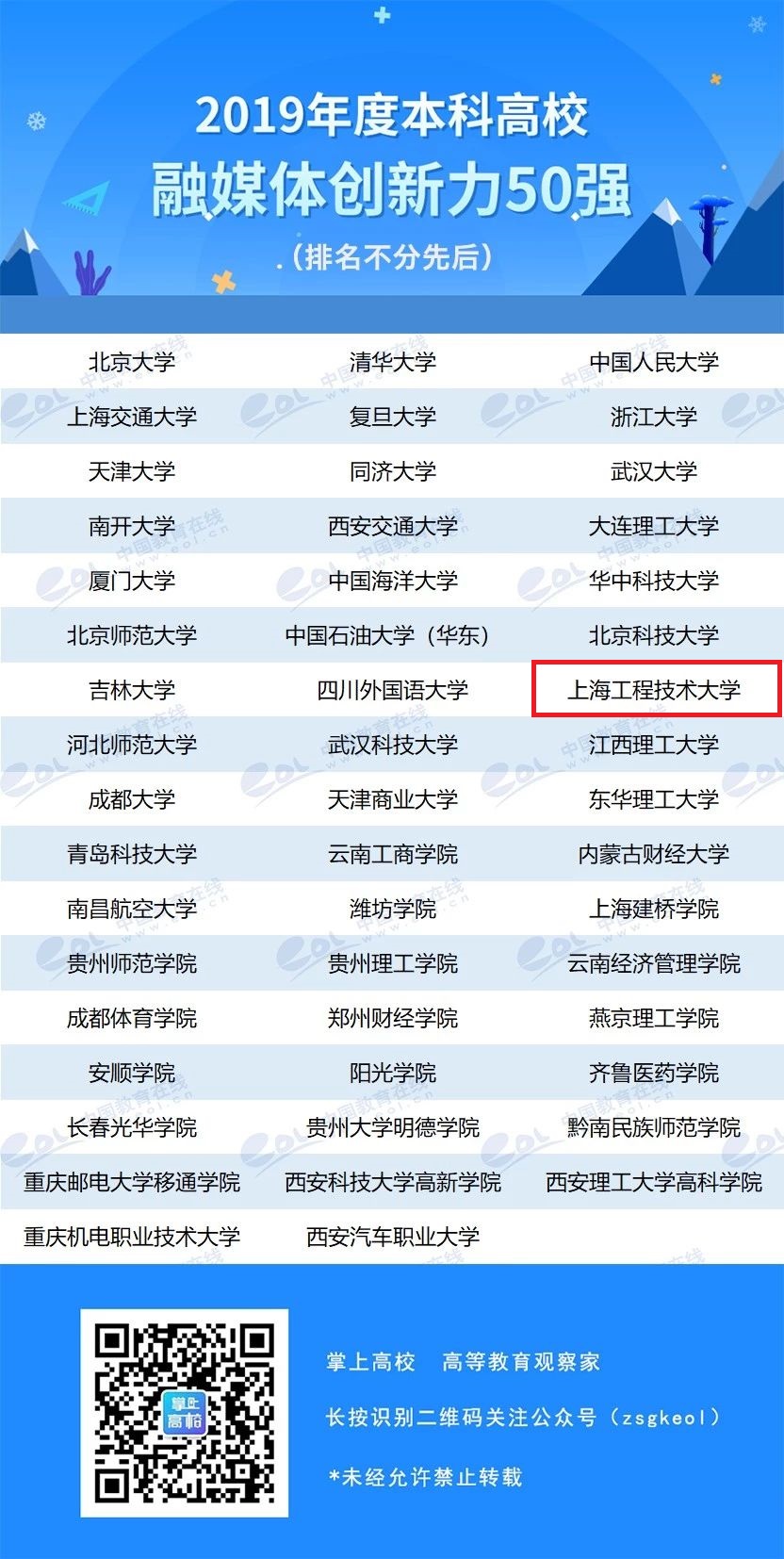 日前,“榜样力量·中国教育在线2019年度教育评选”获奖榜单出炉。上海工程技术大学荣获全国“2019年度本科高校融媒体创新力50强”。