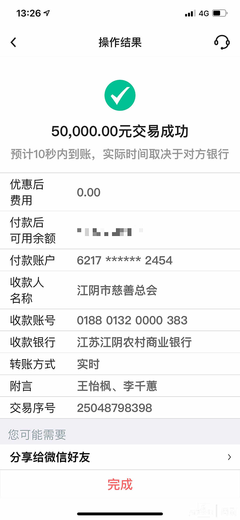 因为疫情,原定今年2月下旬办婚礼的上海工程技术大学艺术设计学院青年老师李千惠决定推迟。今天,他和丈夫王怡枫决定把攒了很久、也期待了很久的蜜月旅行费5万元捐给了江阴市慈善总会。
