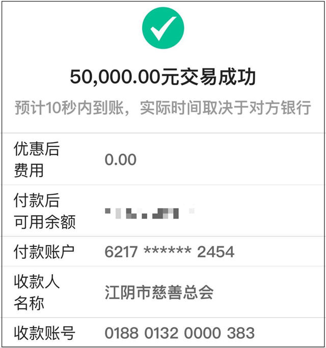 昨天,两人将5万元钱款悉数捐给江阴市慈善总会,并附言:“我夫妻二人本计划二月举办婚礼,现国家有难、匹夫有责,我二人将用于婚后蜜月经费款捐与政府,以一己微薄之力,望国家早日打赢战役!向战斗在抗疫一线的工作人员致敬!”