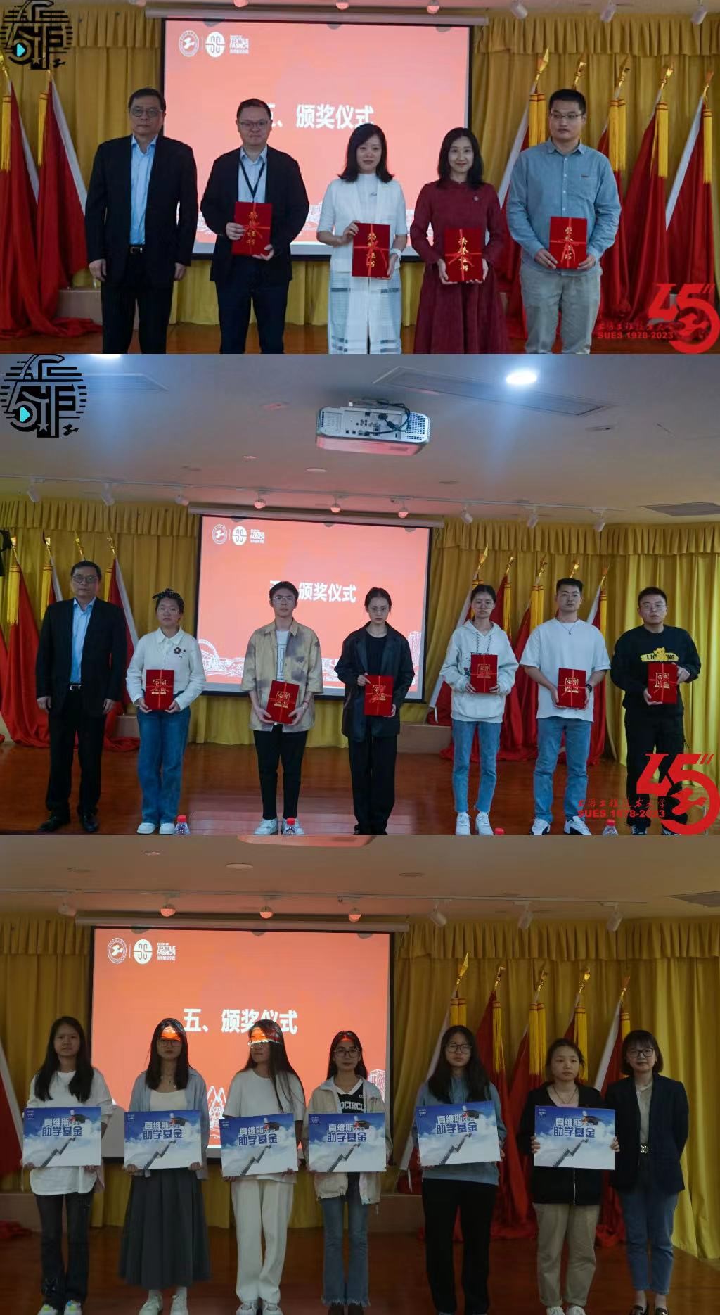 上海申达股份有限公司技术总监兼上海汽车地毯总厂有限公司总工程师龚杜弟向东方国际奖学金奖教金的获奖师生代表颁发证书。上海市青少年发展基金会副秘书长邵睿怡向真维斯助学金获奖学生代表颁发证书。筑客网络技术(上海)有限公司综合管理部副经理马辉为获奖学生代表颁发“铸人·筑梦-筑集采奖学金”“滴水·筑梦-筑集采助学金”证书。