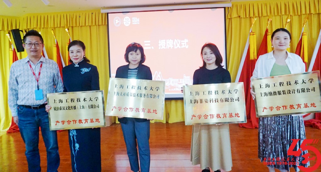 学院副院长曲洪建为上海天祥质量技术服务有限公司、镜泊秦汉文化传播(上海)有限公司、上海纳薇服装设计有限公司、上海菲姿服饰有限公司授予产学合作教育基地铜牌。副院长徐丽慧为镜泊秦汉文化传播(上海)有限公司授予研究生实践基地和服装设计师数字化定制平台铜牌。副院长李春晓为上海英沐文化传媒有限公司授予校友驿站铜牌。