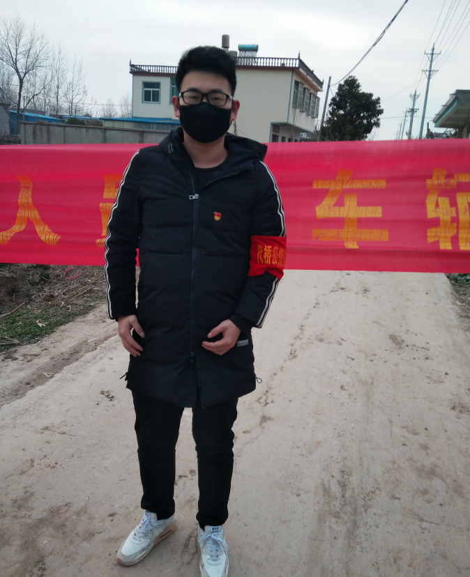 “面对这次突发疫情,作为党员,要树立大局意识,增强责任心,加强宣传,奋斗在防疫的一线。不忘初心、牢记使命,抗击疫情,我们党员在行动!”电院研究生第四党支部党员宋紫阳,响应村委会的号召,主动加入到家乡安徽省蚌埠市固镇县杨庙乡任湖村的疫情防控志愿工作中,每日8:00-18:00之间,在党员示范岗负责道路设卡检查、紧控人员流动,做好相关信息登记,为抗击疫情、保护村民健康贡献自己的力量。!