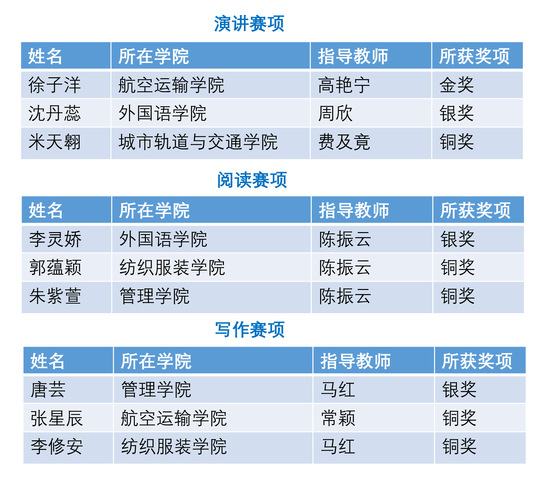 11月4日,2023“外研社•国才杯”“理解当代中国”全国大学生外语能力大赛英语演讲赛项上海赛区复赛在上海交通大学圆满落幕,在外国语学院的指导下,航空运输学院(飞行学院)飞行技术专业2021级学生徐子洋凭借扎实的语言功底和出色的舞台风格荣获金奖(特等奖)并晋级全国总决赛。本次比赛,我校获得历史最好成绩。演讲赛项获得上海市复赛金奖1名,银奖1名,铜奖1名;阅读大赛获得银奖1名,铜奖2名;写作大赛获得银奖1名,铜奖2名。