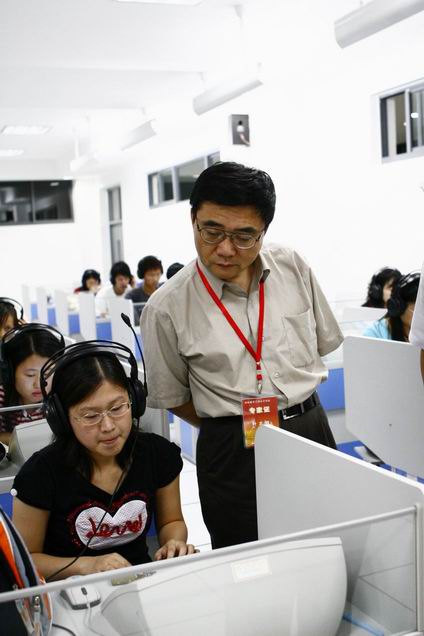 9月21日晚上7:30,评建工作专家组副组长叶志明教授来到实训二号楼3楼的语音实验室,对同学们进行英语听力测试,受到师生们的热烈欢迎。