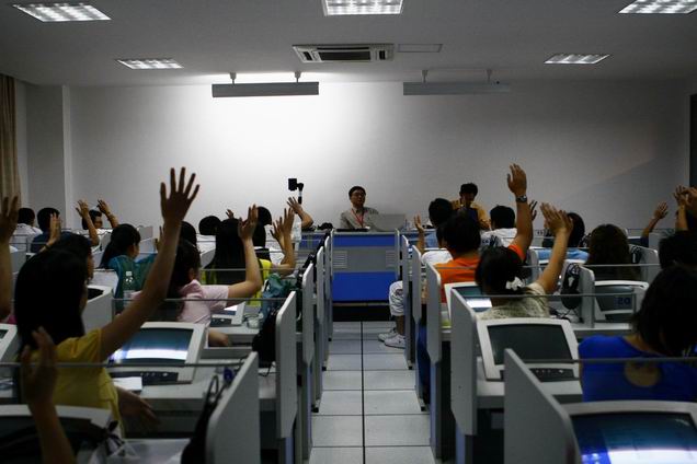 9月21日晚上8:00,评建工作专家组副组长叶志明教授视察了在实训楼2号楼三楼语音实验室进行自主英语学习的学生们。