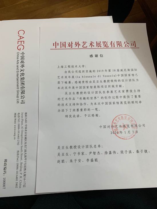 近日,中韩多媒体设计学院吴亚生教授设计团队收到中国对外艺术展览有限公司发来的感谢信,感谢我校由吴亚生教授领衔的设计团队为2019年第58届威尼斯国际艺术双年展中国国家馆展览项目所做的贡献。