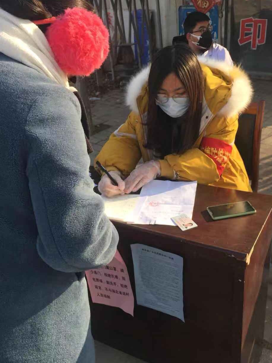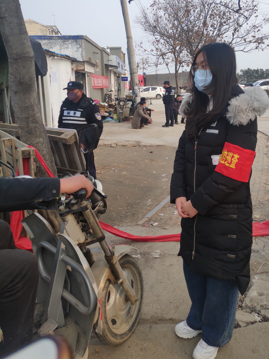 “您好,现在新型冠状病毒疫情严重,您现在外出有被感染的危险,请您配合防控工作,返回家中,也是为了您家人的健康!”这是学院通信信号学生党支部本科生党员胡文慧在徐州市沛县朱寨镇闫集社区参与疫情防控志愿者服务中最常说的一句话。徐州市沛县朱寨镇闫集社区共有5800多口人,丰沛大道穿社区而过,社区有多个出入口,给疫情管控工作带来了很大挑战。胡文慧得知社区干部正在组织志愿者抗击疫情的消息后,她主动请缨,挺身而出,联系社区干部志愿加入抗击疫情的队伍中。一张办公桌、一簿登记册、一把方板凳,构成了胡文慧在闫集市场南门服务抗击疫情的主要阵地,为保护群众健康安全贡献着自己的力量!