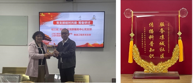 11月10日下午,虹口区凉城新村街道妇联主席、科协负责人程军红,凉城社区党群服务中心主任李晨露等一行来到高职学院,代表凉城新村社区党群服务中心党支部、街道科协、街道新时代文明实践分中心向学院制造工程系赠送锦旗,感谢学院制造工程系在过去一年中对凉城街道普及科技知识的大力帮助以及对技能进社区等工作的鼎力支持,高度肯定学院团队的工作成果。