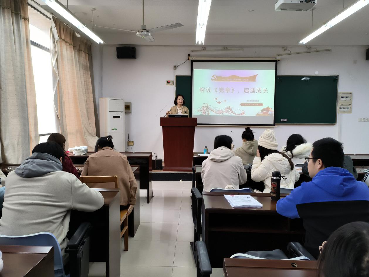 11月15日,纺织服装学院在艺术楼C310举行“解读党章,启迪成长”入党启蒙讲座。学院党委副书记谢志霞主讲,党章学习小组全体组员聆听。