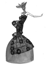 这款设计作品正是整个“熔炉”过程的第三个环节——重生。衣服的上身与下身均有一小一大两个放大版的胸衣造型装饰,犹如人们改变之前的自己,而下身大廓型的裙摆则象征着融化,蜕变的灰烬,桃心形领口的贴身裙则象征着重生后的崭新的自己。胸衣装饰上缝有面料改造,毛茸茸的黑色人造毛象征延烧时的火焰以及飘散在空中的烟雾,黑色的不规则排列的珠子则象征着燃烧后物体表面留下的痕迹。