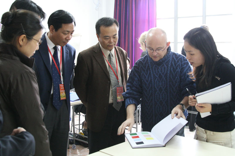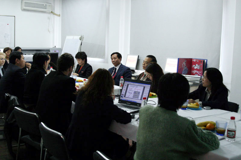 肖瑞峰教授、张国建教授听取了学院的自查报告,对学院的办学理念、目标定位、师资队伍结构、教学特色、管理机构等方面的情况有了进一步的了解。专家们与学院领导还交流了外教聘用和学生考核等教学方面的问题,并对中法埃菲时装设计师学院作为中外合作本科教育的典范表示了极大的兴趣,同时就中法双方的合作模式、经费运作等详细内容与学院领导进行了探讨。  汇报会后,专家走进课堂参观了外教们的授课情况。在制作课上,Faux教授向专家们展示了学生最新完成的毕业设计立体裁剪部分的作品,评估专家张国建教授提出了培养学生要注重共性与个性双向发展的建议;Hobert教授与Nicole教授向专家展示了他们的教案;Denis Barricault教授则向专家展示了学院学生通过电脑与手绘相结合所完成的设计资料册。同时,专家们还考察了学院资料室与阅览室的整体情况。