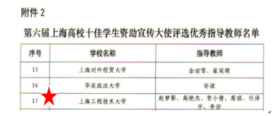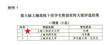 近日,由上海市教卫工作党委、上海市教育委员会指导,上海市学生事务中心主办的“我为资助代言”第六届上海高校十佳学生资助宣传大使评选活动结果揭晓,我校电子电气工程学院刘婧同学在评选中脱颖而出,荣获一等奖,成功入选“上海十佳学生资助宣传大使”,赵梦影、高艳杰、贺小倩、席琪、任泽宇、李迎六位老师获得“优秀指导教师”荣誉称号。