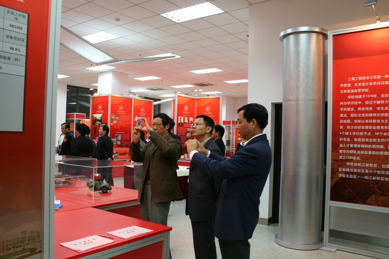 评估专家组组长肖瑞峰教授认真地听取了校办主任史健勇关于学校发展历史及成长历程的汇报。于世宏教授、赵立涛博士对学校的各类教学课本及《上海工程技术大学教育改革与发展丛书》等尤为关注。张国建教授用随身相机拍摄了“市领导关怀我校”等展板图片及学校历年来获得的各类奖状、奖杯等陈列品。
