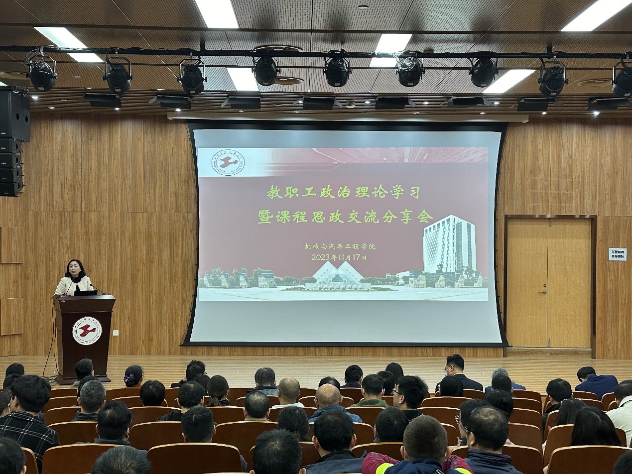 为推进学院课程思政分中心高质量建设,落细落实课程思政建设工作,促进各系室间特色课程思政资源交流分享,提升教师课程思政建设意识与能力。11月17日上午,机械与汽车工程学院在现代交通大楼8B126举办教职工政治理论学习大会暨课程思政交流分享会。学院党政领导班子,各系室、职能部门全体教职工参加学习,会议由学院工会主席周玉凤老师主持。