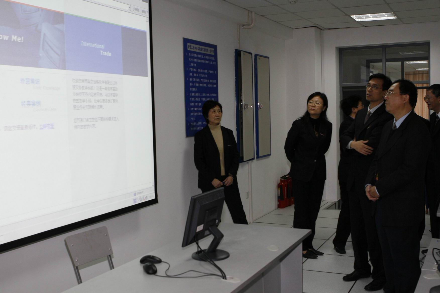 11月22日上午9:30,评估组专家李一军教授在汪泓校长及管理学院负责人的陪同下参观了管理工程中心实验室。李一军教授考察了国际贸易实验室、金融实验室、物流实验室和工商管理实验室,听取了学院领导及有关老师对各实验室情况的详细介绍,李一军教授还详细询问了有关实验室配置及利用率、实验室管理和开放情况,并对金融实验室的世华财讯系统的情况给予肯定。