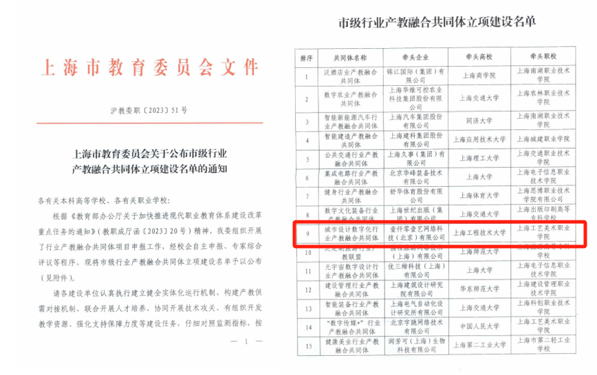 近日,由上海工程技术大学、上海工艺美术职业学院、壹仟零壹艺网络科技(北京)有限公司三方联合牵头成立的全国城市设计数字化行业产教融合共同体获批,被上海市教育委员会列入建设名单。全国城市设计数字化行业产教融合共同体将通过“两建设、两打造、多元创新”的任务体系,打造集人才培养、技术研发、行业服务于一体的产教融合平台,为城市设计与数字化发展贡献人才与技术,形成高质量的行业认可度和国际影响力。首批成员单位覆盖全国20多个省份,包括普通高校4所、科研机构3所、中高职院校30余所、相关行业企业30余所。