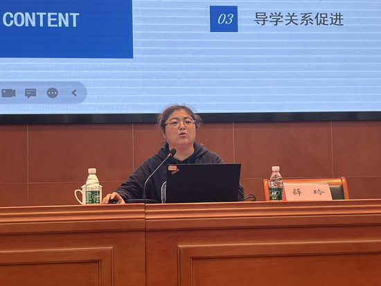 薛玲主任作了《我校研究生心理健康状况分析及导学关系促进》的报告。用数据详细阐述我校研究生的心理状况,分析研究生群体面临的心理问题,最后就如何促进导学关系、助力导师队伍身心健康、引领研究生健康成长成才进行了探讨。