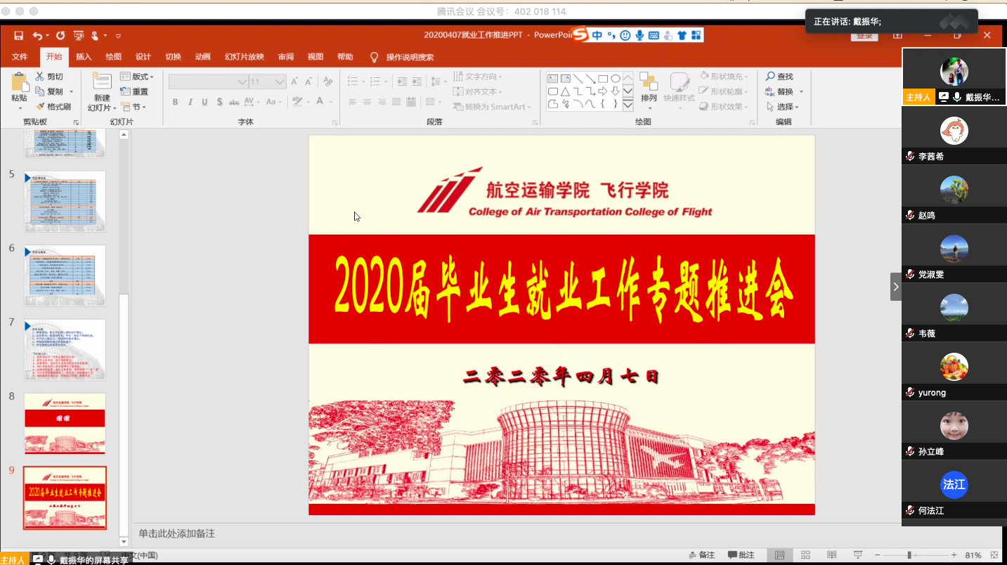 为深入研判2020届毕业生就业工作形势,全力做好2020年毕业生就业工作,4月7日下午,航空运输学院(飞行学院)在腾讯会议平台召开学院就业工作专题推进会。学院党政领导班子、各系室主任、全体毕业班辅导员老师出席了本次会议。会议由学院党总支副书记戴振华老师主持。
