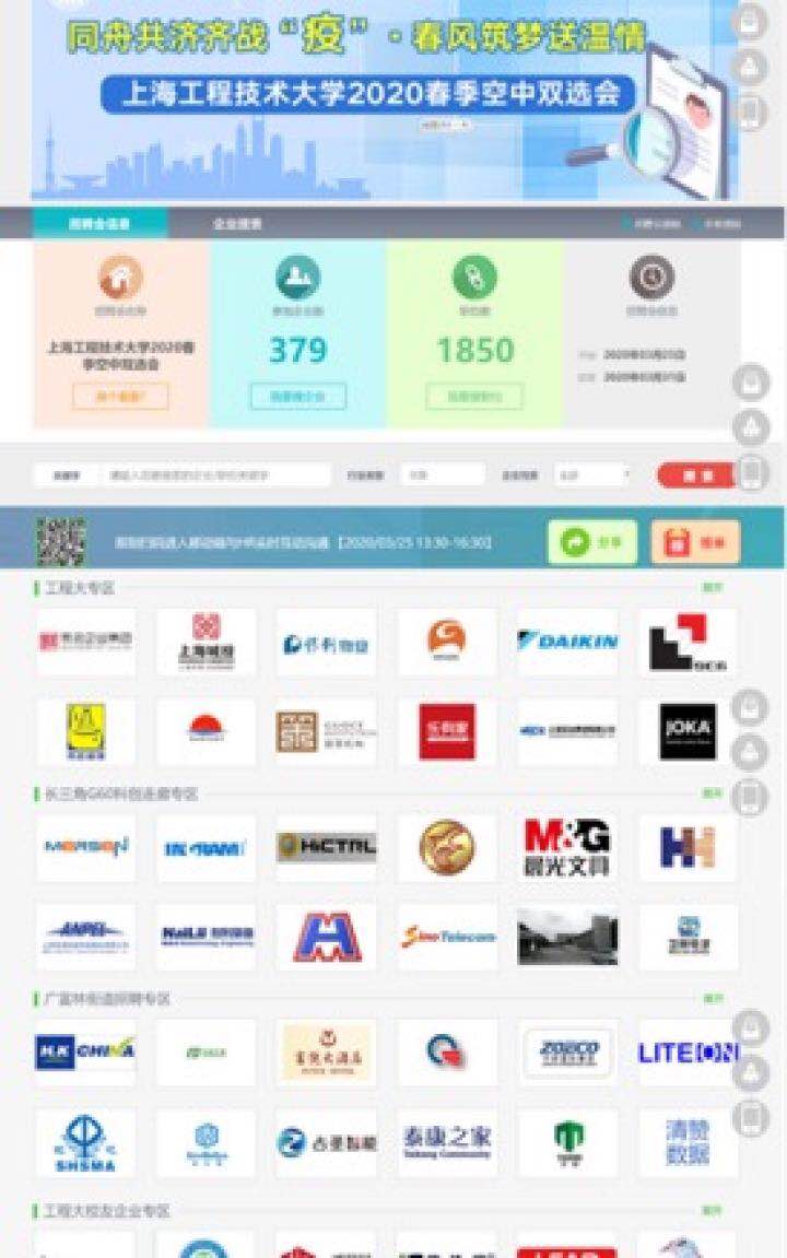 在学校精心安排下,本次空中双选会共吸引了379家企业报名参加,提供工作岗位1850余个,岗位需求人数近8000人,1603位毕业生全程参与本次空中双选会,在线投递简历达12208次,平均每位毕业生投递简历7.62次。学校主动服务“长三角G60科创走廊建设”等国家战略,积极对接长三角“G60科创走廊”联席办公室及G60九城人社部门,特别设立“长三角G60科创走廊”专区,吸引了100余家G60科创走廊企业参与线上招聘。